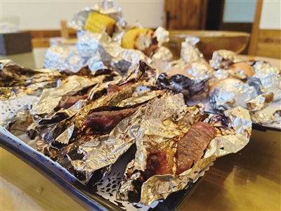 不一會兒,烤肉的香味逐漸散發(fā)出來。李瑞將不同食材分別裝盤,放上標簽端上餐桌。食客們不顧燙手,迅速剝開外層的錫紙。剛出爐的烤肉,被錫紙鎖住水分,色澤鮮亮、外酥里嫩。咬上一口,油脂在嘴里化開,鮮香的味道讓人贊不絕口。