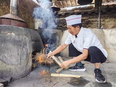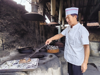 兩個小時后,窯里的石塊已經(jīng)烤得發(fā)紅,肉也腌好了。牛肉、羊排、豬排、雞翅等肉類和紅薯、玉米、雞蛋等放了進去。每種食材都有最佳的烤制時間,對于這些,李瑞早已了然于胸。他會將時間控制在客人進院落座就剛好端上來,這才是最佳食用時間。