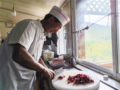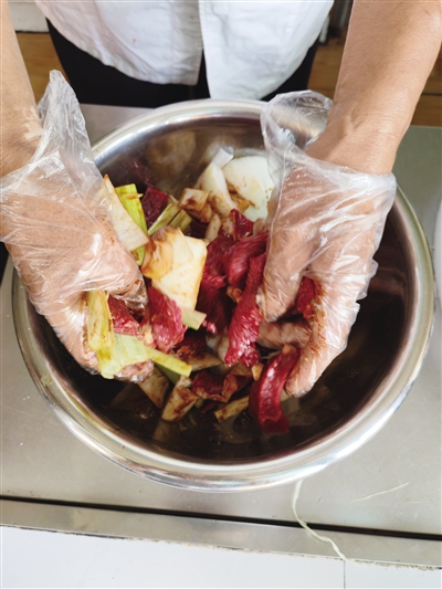 8月2日,68歲的李瑞一早就忙活起來,今天有十幾位客人來用餐,土窯烤肉制作過程較長,所以提前幾個小時就要開始準備工作。從村里養(yǎng)殖戶家預定的牛羊肉已經(jīng)送了過來,李瑞仔細剔除筋膜后,按照肉的紋理切成拇指粗的段,加上洋蔥、大蔥和十幾種調(diào)料腌制幾個小時后,鮮肉用錫紙包好就可以準備入窯了。